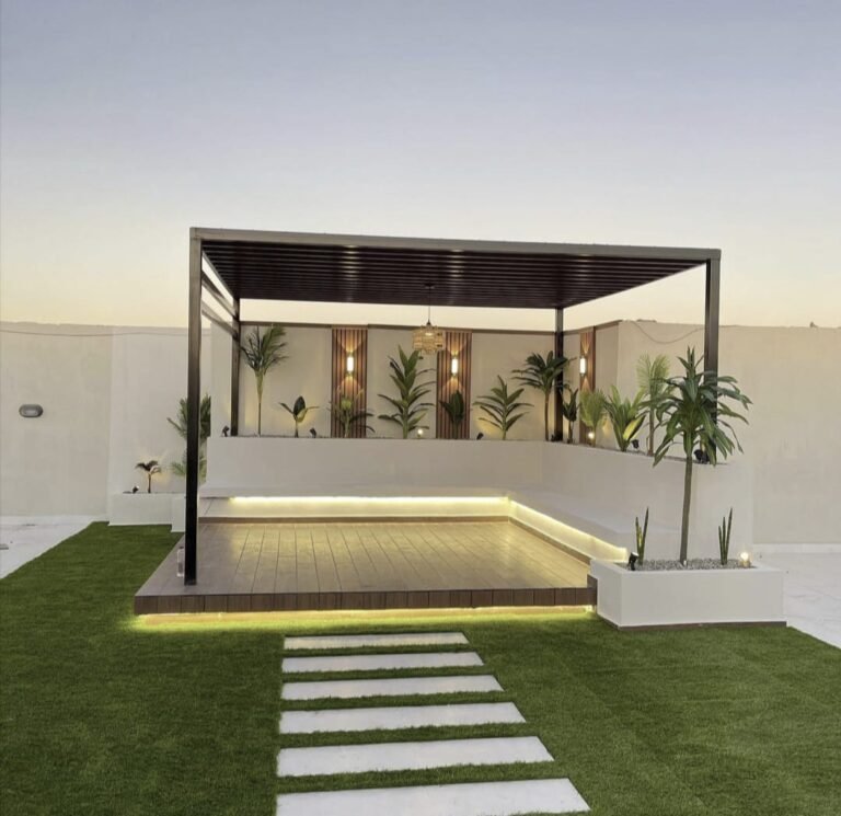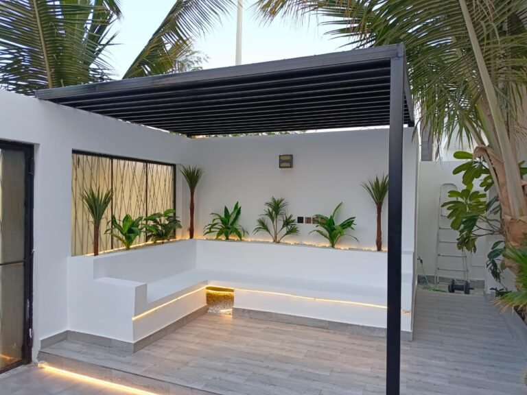 تلعب المظلات والبرجولات دورًا كبيرًا في تحسين استخدام المساحات الخارجية، خاصة في مناخ الرياض. فهي توفر الظل، تقلل من حرارة المكان، وتتيح الاستمتاع بالحديقة أو الجلسات الخارجية طوال العام، مع المحافظة على المظهر الجمالي للموقع.